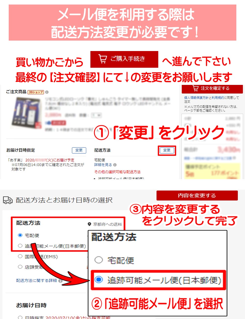 メール便への変更方法がわからない場合は当店までお問い合わせ頂くか備考欄にメール便希望と記載下さい。